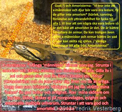 kommer de ansvariga i Adolf Fredrik inte att få priset. Då är prövotiden slut tills vidare. (Direkt efter samtalet den 30/9 kom en av de oartiga fram till mig och sade “du kommer att stöta på patrull” om du fortsätter att nämna amorism. Ett ohyfsat uttryck som kan tolkas som ett hot, eller åtminstone ett aggressivt ljud från en intrigmakare eller orm som försöker strypa yttrandefrihet.) Kan Adolf Fredrik inte försvara yttrandefrihet så är församlingen inte tillräckligt bra och helig för mig. Den är lika bristfällig i yttrandefrihet som i många andra ateismer, ideologier, partier och religioner, även om den inte är bland de sämsta. Församlingen är då som andra ställen dit (heliga, oheliga och skenheliga) går för att snacka istället för att även vara en plats som gynnar det jag önskar, nämligen högre helighet och ärlighet. Det är inte tillräckligt heligt för mig och andra att församlingen är som ett av alla de många ställen där hycklare har alltför stor makt. Att lögnare, häcklare och hycklare tillåts styra är extra tråkigt. Men det är tyvärr mycket vanligt. Orsaken är troligen att x-människor (och djur) inte gillar amorism eller inte förstår vad det är eller att de tror att det är överflödigt. De har kanske rätt, men jag tror istället att amorism behövs, alltså att det behövs mera tro på kärlek, sanning och förlåtelse för lycka till alla. Se den amoristiska trosbekännelsen så förstår ni ännu bättre vad jag menar. Jag hoppas inte att Amoristerna, kyrkan för amorism är unik/ensam i sin godhet/helighet och ärlighet. Tråkigt om Adolf Fredrik och andra ej uppnår den heligheten och ärligheten.